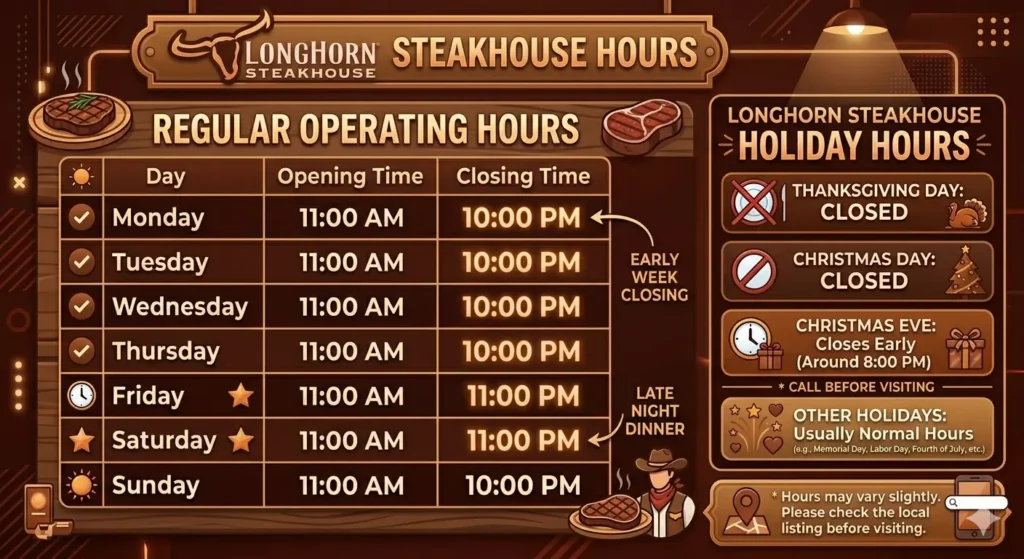 Longhorn Steakhouse usually opens at 11:00 AM and closes at 10:00 PM from Sunday to Thursday. But on Friday and Saturday, it stays open until 11:00 PM to serve late dinner guests. Hours may vary slightly, so it’s a good idea to check the local restaurant listing before visiting. But most commonly, hours are the same as mentioned below.